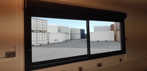 Com portas marítimas de alta segurança, porta de serviço em aço Corten e uma persiana elétrica em alumínio, este contentor assegura acessibilidade, robustez e funcionalidade, adaptando-se perfeitamente a contextos interiores e exteriores.